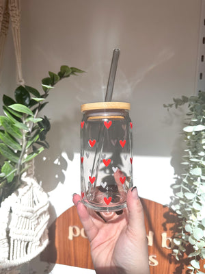 Little red hearts cup, coffee drinker cup, little red hearts glass cup with bamboo lid, resizable glass coffee cup, cold brew cup