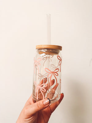 pink bows cup, coffee drinker cup, pink bows glass cup with bamboo lid, resizable glass coffee cup, cold brew cup